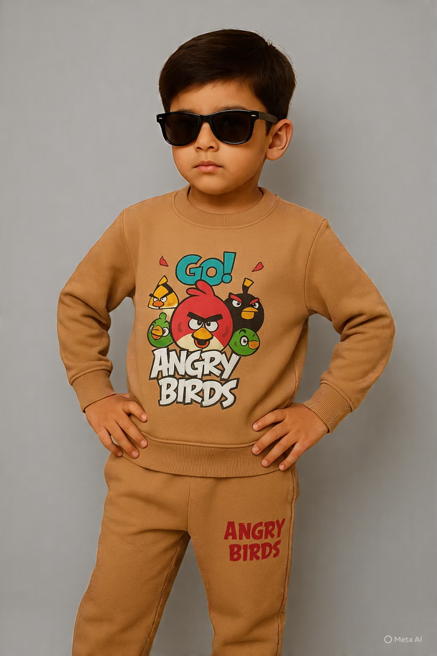 Introducing our stylish Angry Birds tracksuit, perfect for young trendsetters! This cozy, tan-colored set includes a sweatshirt featuring the iconic “Go! Angry Birds” graphic with vibrant cartoon characters, and matching pants with bold red “ANGRY BIRDS” lettering on the leg. Made from soft, comfortable fabric, this tracksuit is ideal for everyday wear, playtime, or casual outings. The relaxed fit and long sleeves keep kids snug and fashionable all day long.