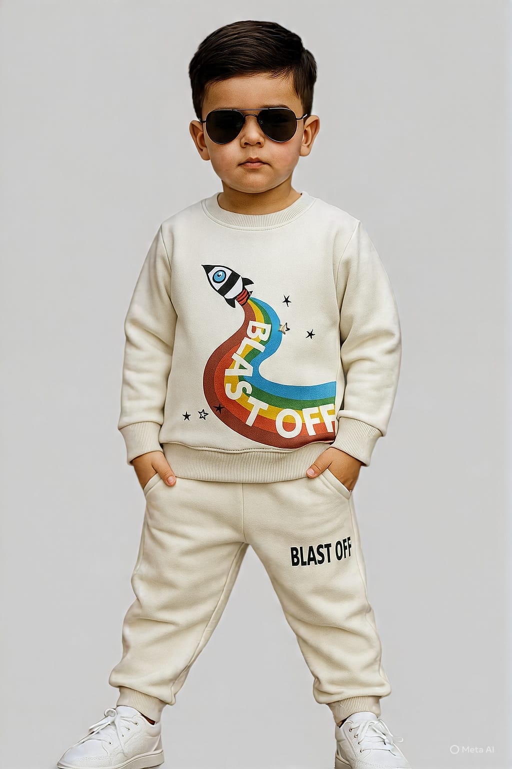 Take your little astronaut on a rocket‑powered style adventure with our premium Blast Off tracksuit! This off‑white set features a fun graphic sweatshirt with a colorful rocket and rainbow “BLAST OFF” print, paired with matching jogger pants that showcase the bold “BLAST OFF” logo on the leg. Made from soft, breathable fabric, it offers ultimate comfort for playtime, school, or casual outings. The stylish design is completed with ribbed cuffs and a trendy crew neck. Perfect for kids who love space and adventure, this tracksuit makes every day feel like a launch!