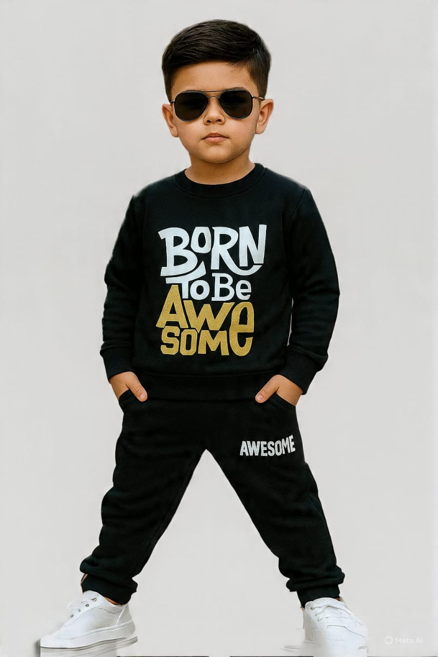Elevate your little star’s style with our premium black tracksuit, crafted for comfort and flair. Featuring a bold front‑print “BORN to Be AWESOME” in white & gold glitter letters and a matching “AWESOME” patch on the leg, this set makes every day feel like a celebration. Made from soft, breathable fabric, it offers all‑day comfort for playtime or casual wear. Paired with sleek white sneakers and cool sunglasses, your child will shine with confidence and charm. Perfect for gifting or everyday awesomeness!